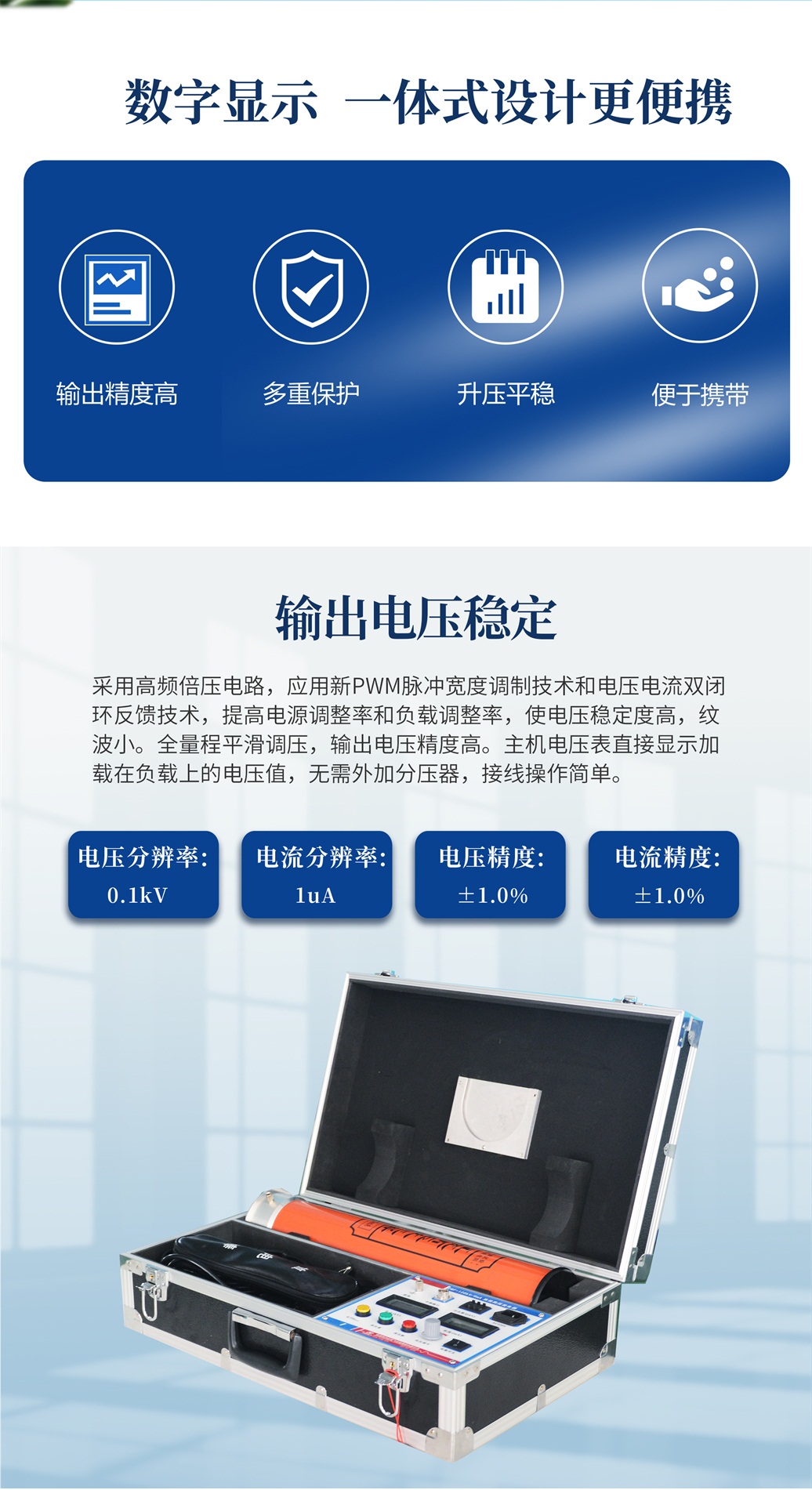 采用了高頻倍壓電路,應(yīng)用了新的PWM高頻脈寬調(diào)制技術(shù),閉環(huán)調(diào)整,采用了電壓大反饋,使電壓穩(wěn)定度大幅度提高。使用性能卓越的大功率IGBT器件及驅(qū)動(dòng)技術(shù),并根據(jù)電磁兼容性理論,采用特殊屏蔽、隔離和接地等措施。使直流高壓發(fā)生器實(shí)現(xiàn)了高品質(zhì)、便攜式,并能承受額定電壓放電而不損壞。具有輸出功率大、體積小的特點(diǎn),有可靠的過(guò)壓、過(guò)流及零位合閘保護(hù)功能,帶0.75倍電壓切換功能。