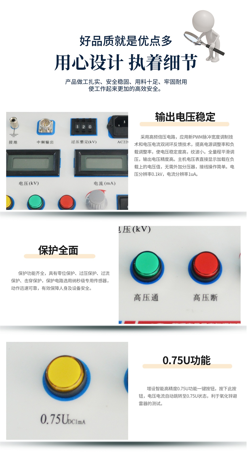 (5)增設(shè)高精度0.75UDC1mA功能,為做氧化鋅避雷器測(cè)量帶來(lái)極大的方便。