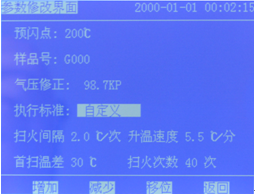 1)在此界面中預閃點、樣品號、氣壓、標準和時間,都可按提示進行調(diào)整,修改完成后按【返回】鍵。回到主操作界面。