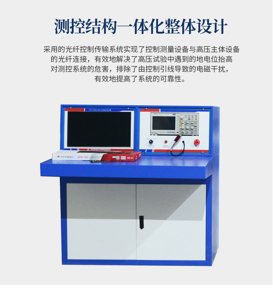 4、采用的光纖控制傳輸系統在國內高壓試驗設備中是創新,它實現了控制測量設備與高壓主體設備的光纖連接,有效地解決了高壓試驗中遇到的地電位抬高對測控系統的危害,排除了由控制引線導致的電磁干擾,極大地提高了系統的可靠性。