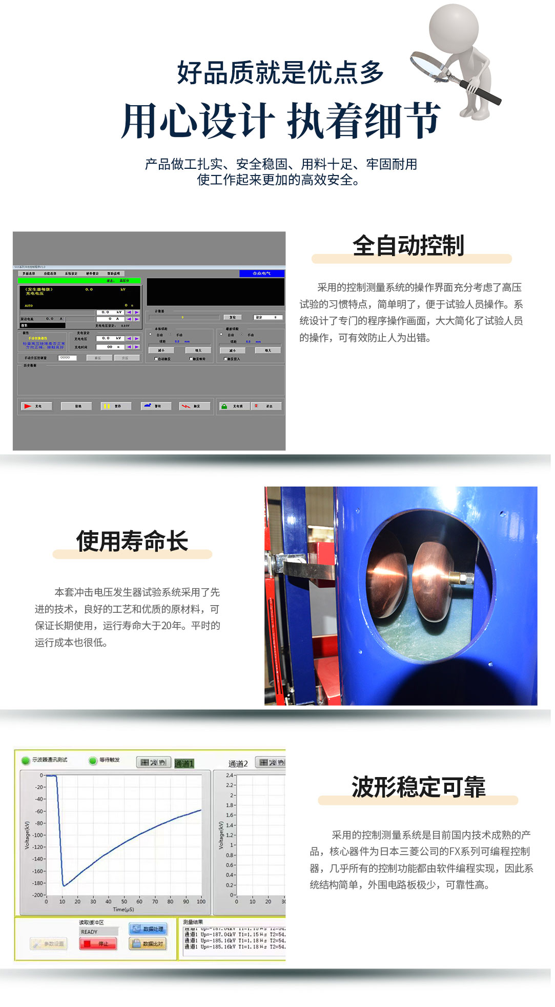 6、本套沖擊電壓發生器試驗系統采用了先進的技術,良好的工藝和優質的原材料,可保證長期使用,運行壽命大于20年。平時的運行成本也很低。