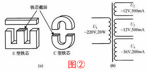 3、電源變壓器是最常用的一類變壓器。電源變壓器的主要參數是功率和次級電壓、電流。功率與鐵芯截面的平方成正比,如圖②(a)所示,鐵芯截面越大,變壓器功率越大。電源變壓器的用途是電源電壓變換,并可同時提供多種電源電壓,以適應電子電路的需要,如圖②(b)所示。制作時應根據需要選用具有符合要求的次級電壓、電流的變壓器。
