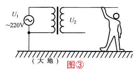 4、電源變壓器的另一用途是電源隔離。由于變壓器的隔離作用,即使人體接觸到電壓U2,也不會與交流220V市電構成回路,保證了人身安全(圖③)。這就是維修熱底板家電時必須要用電源隔離變壓器的道理。