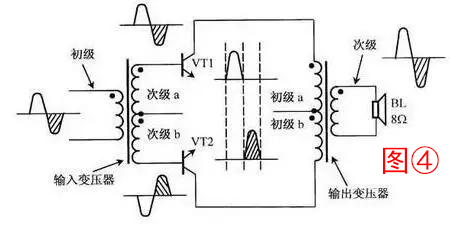 5、音頻變壓器工作于音頻范圍,具有信號電壓傳輸、分配和阻抗匹配的作用。圖④所示為推挽功率放大器電路,輸入變壓器將信號電壓傳輸、分配給晶體管VT1和VT2(送給VT2的信號還倒了相),使VT1和VT2交替放大正、負半周信號,然后再由輸出變壓器將信號合成輸出。輸出變壓器同時還將揚聲器的8Ω低阻變換為數百歐姆的高阻,與放大器的輸出阻抗相匹配,使得放大器輸出的音頻功率最大而失真最小。