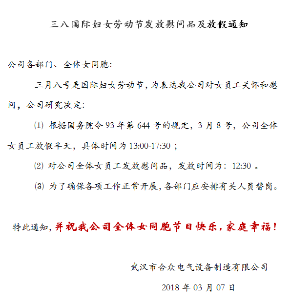 關于三八婦女節,合眾電氣全體女員工放假的通知: