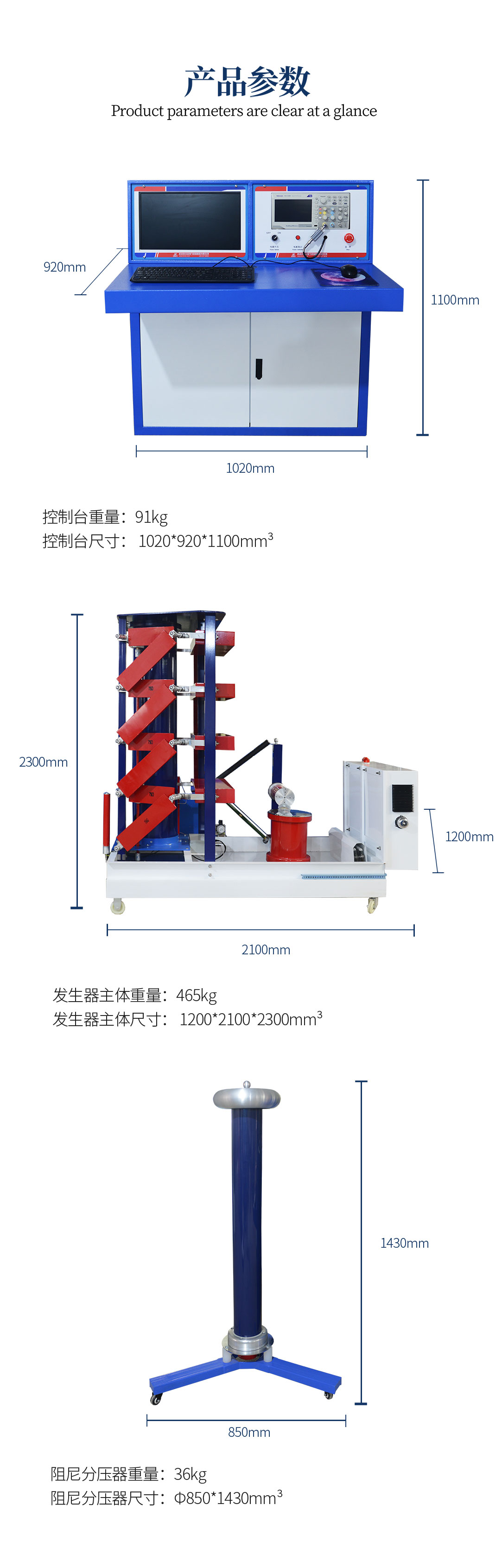 波頭時間:1.2±30%μs,波尾時間:50±20%μs,過沖:小于5%,效率:不低于90%。±1.2/50μs標準雷電沖擊電壓全波,效率大于90%。