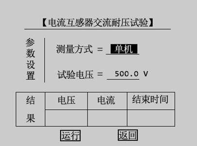 注意:為保護(hù)互感器綜合特性測(cè)試儀內(nèi)部器件和人身安全,嚴(yán)禁連續(xù)做交流耐壓試驗(yàn),兩次交流耐壓試驗(yàn)時(shí)間間隔必須大于3分鐘。