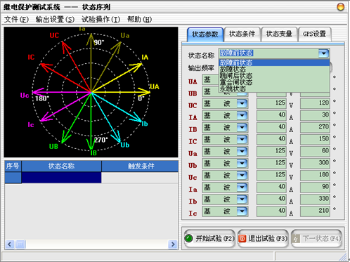 在微機繼電保護測試儀(鍵盤版)界面右邊的“狀態參數”屬性頁中設置當前狀態的狀態名稱、輸出頻率和各通道的輸出類型、幅值、相位。